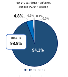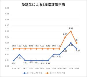 2025年9月の平均スコアは、ネイティブコーチのレッスン評価が4.93(前月8月は4.94)と、コンサルタントのサポート評価が4.94(前月8月は4.96)と、引き続き受講生からの高い評価をいただいています。