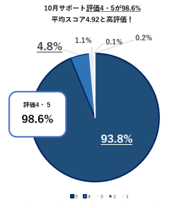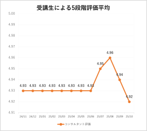 2025年10月の平均スコアは、コンサルタンのサポート評価が4.92(前月9月は4.94)と、引き続き受講生からの高い評価をいただいています。