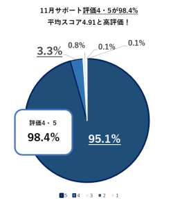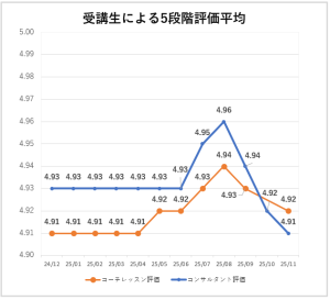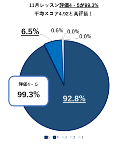 2025年11月の平均スコアは、ネイティブコーチのレッスン評価が4.92(前々月9月は4.93)と、コンサルタントのサポート評価が4.91(前月10月は4.92)と、引き続き受講生からの高い評価をいただいています。